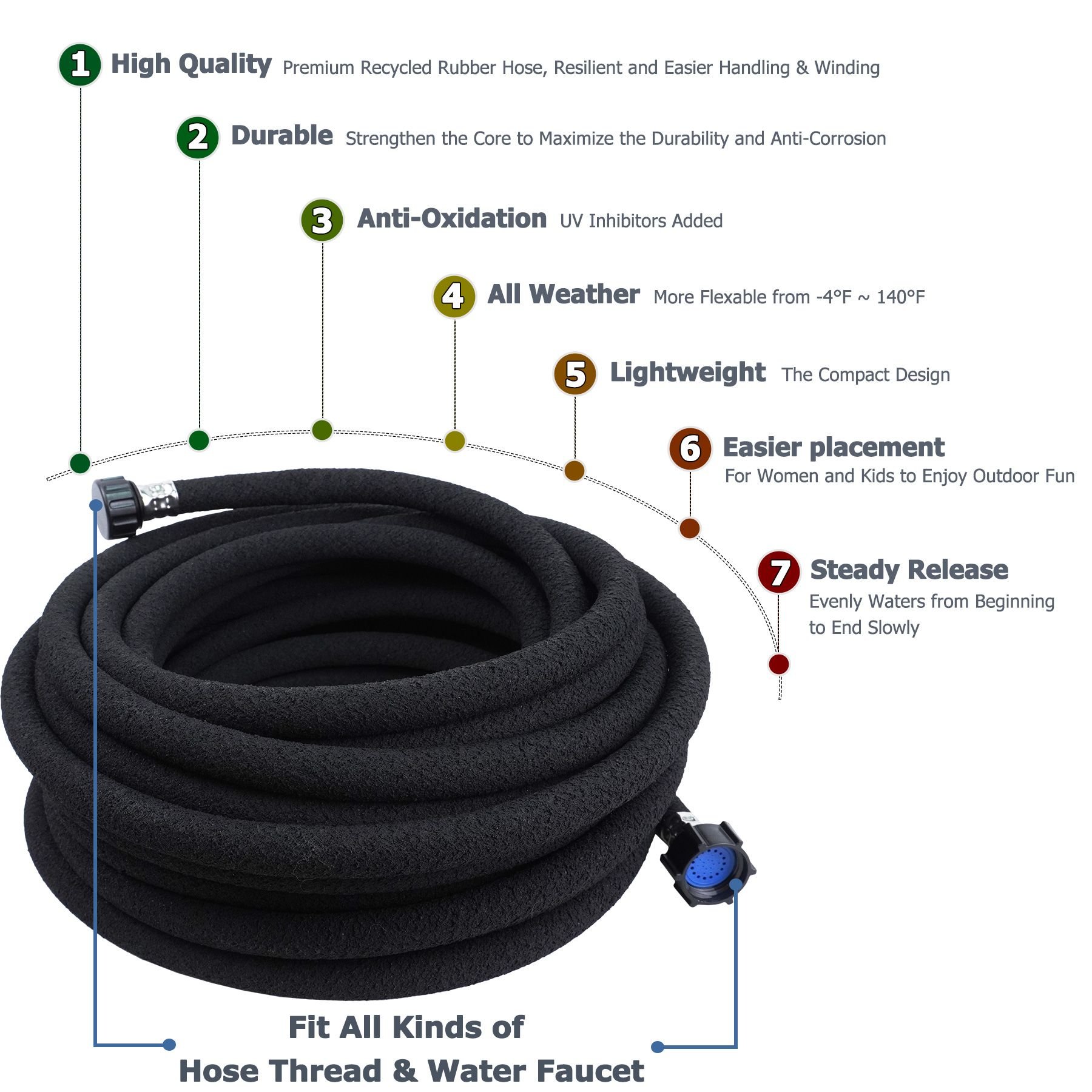Premium Material Made:Heavy duty recycled rubber soaker hose is made to last; this rubber slow soaker hose is a handy garden tool features a unique; non clogging porous design that provides even soaking above or below ground.